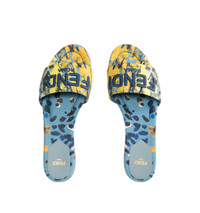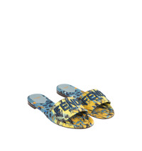 FENDI Sunshine Slides featuring wide-band, silk printed with the multicolored Dew Drops pattern, tone-on-tone silk insole and blue yarn Fendi Roma embossed embroidery. 100% silk. Inside: 100% calfskin. Made in Italy. DESIGNER STYLE ID: 8R8092-AWD8 COLOR: F1V99 ANISE BIG DIPPER