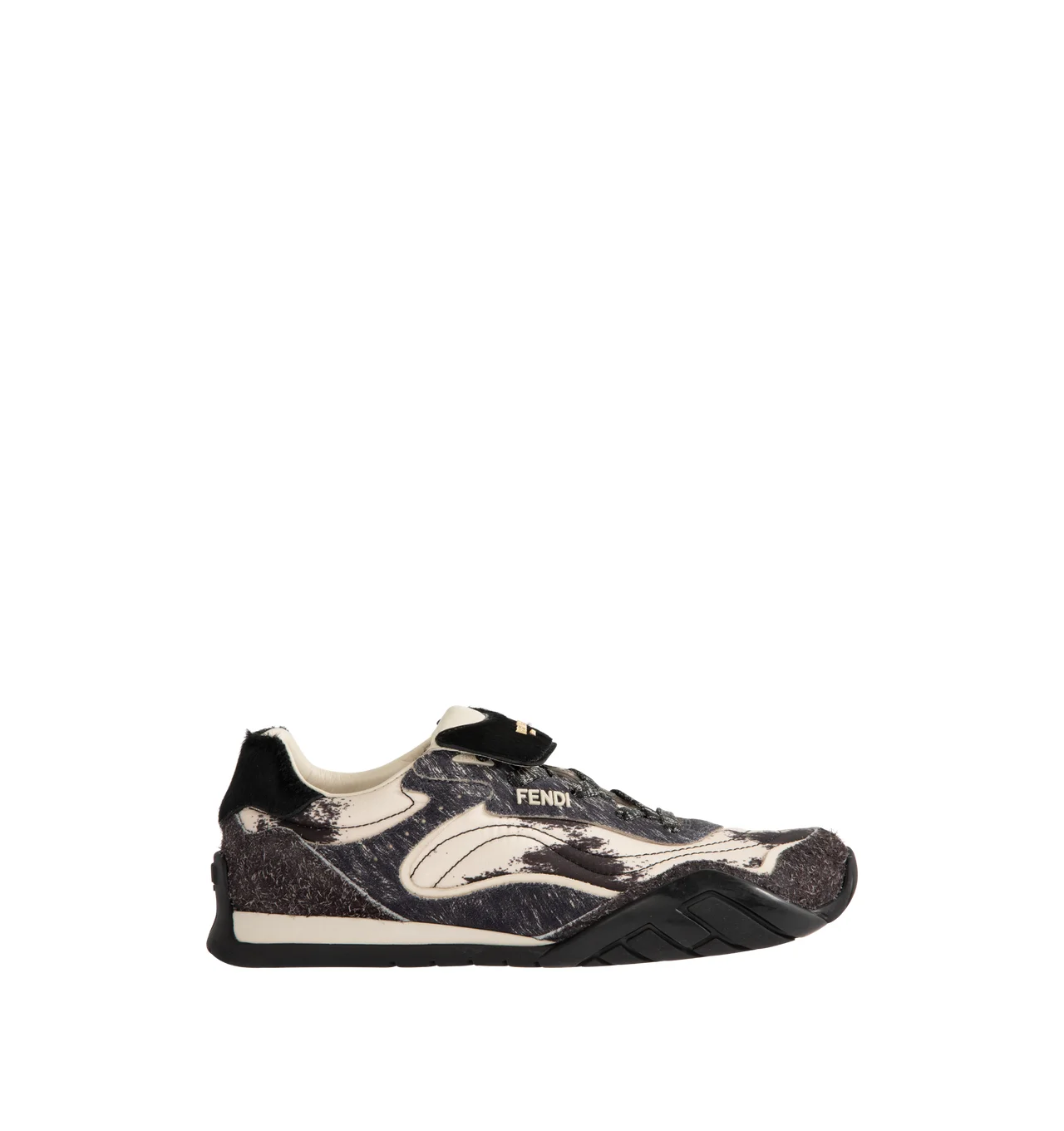 FENDI Wave Pulse Sneaker featuring low-top, lace-up closure, technical fabric with a gray graphic print and matching suede inserts, contrasting black cavallino calfskin details, folded tongue, tubular laces, three-dimensional rubber logo on the side, gold-colored metal Fendi logo on the tongue, rubber running sole with wraparound edge on the side and diagonal F motif. 100% calfskin. 100% polyamide. Inside: 100% lamb leather. Made in Italy. DESIGNER STYLE ID: 8E8820-AYC9 COLOR: F1TY6 ICE GREY/BLACK