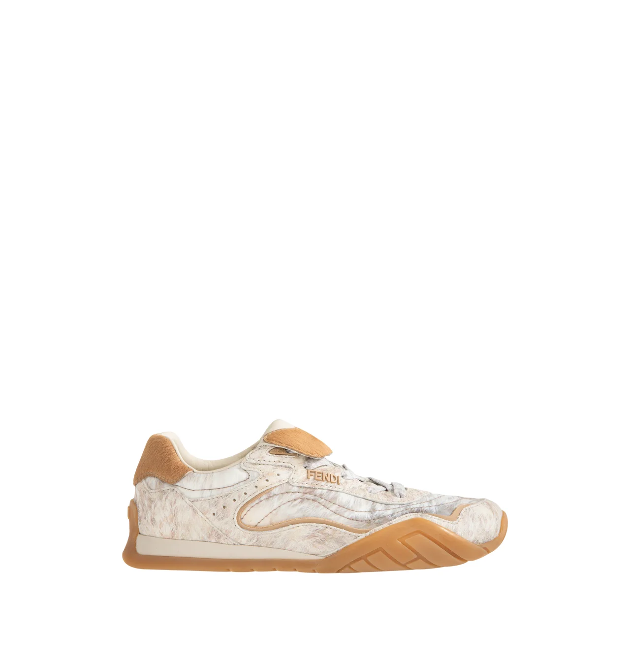FENDI Wave Pulse Sneaker featuring low-tops, lace-up, made of technical fabric with a white graphic print an beige suede inserts, cavallino calfskin fold-over tongue and heel counter, three-dimensional rubber logo on the side, gold metal Fendi logo on the tongue, rubber running sole with wraparound edge on the side and diagonal F motif. 100% calfskin, 100% polyamide, inside: 100% lamb leather. Made in Italy. DESIGNER STYLE ID: 8E8820-AYF0 COLOR: F1TY8 NATURAL/SAND