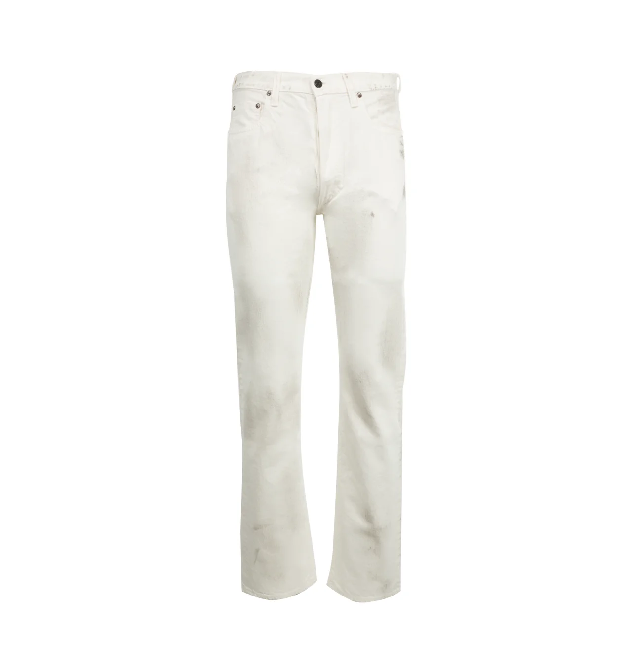 FULLCOUNT Dirty White Denim featuring 12oz selvedge denim, 5 pockets, button closure and distressed throughout. 100% cotton. DESIGNER STYLE ID: 1103WH COLOR: WHITE