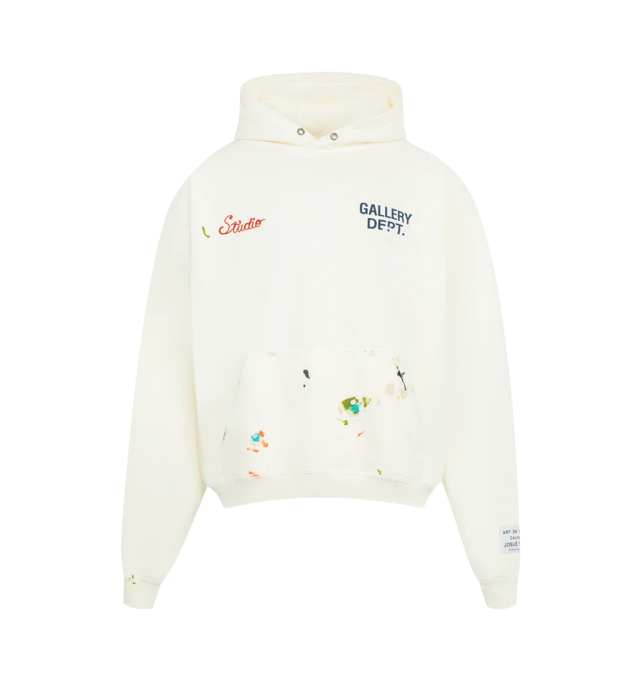 GALLERY DEPT. Studio Hoodie featuring oversized fit, 'Studio' chain-stitch embroidery and a printed GD logo on the front, large 'Art on Display' embroidery on the back, front kangaroo pocket, signature 'art on display' patch appliqued at the cuff and embellished with several leather G-PATCHES on both elbows with a one-of-a-kind carefully curated patch assortment. 100% cotton. Made in USA. DESIGNER STYLE ID: SH-50040 COLOR: LT ARCHIVAL