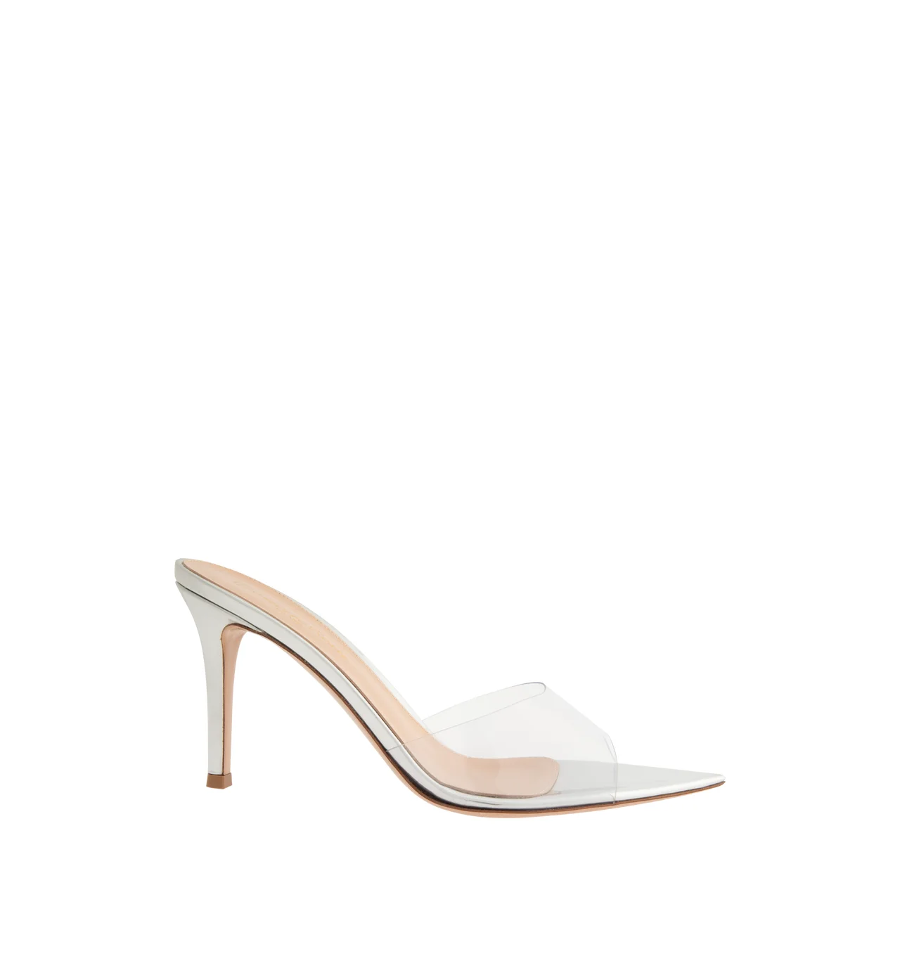 GIANVITO ROSSI Elle Mule featuring an 85mm stiletto heel, pointed-toe style and front upper in soft Plexi for a delicate see-through effect. 100% TPU. Heel height: 3.3 inches / 85 mm. DESIGNER STYLE ID: G11050-85RIC-GMETRAR COLOR: SILVER