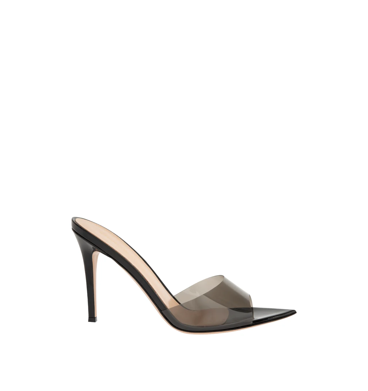 GIANVITO ROSSI Elle Mule 85 featuring open back, pointed toe, TPU strap at vamp, and covered stiletto heel with rubber injection. Heel: H3.25" Upper: thermoplastic polyurethane, leather. Sole: leather, rubber. Made in Italy. DESIGNER STYLE ID: G11050-85RIC-GSVFUNE COLOR: BLACK