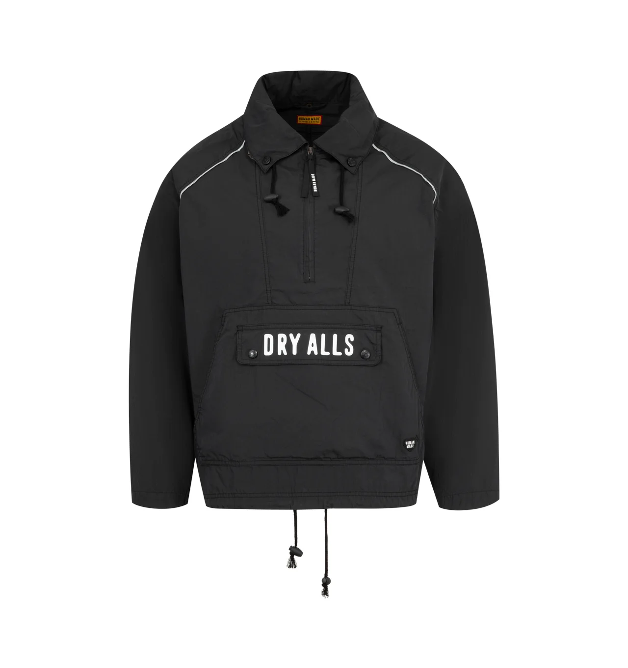 HUMAN MADE Nylon Anorak Jacket featuring half-zip, wrinkled texture, packable hood with snap buttons on the collar, brand logo graphics, heart logo patch on the left chest, sleeve cut-outs, kangaroo pocket with a flap pocket and drawcord allows for silhouette adjustments. 80% cotton, 20% nylon. DESIGNER STYLE ID: HM30JK032 COLOR: BLACK