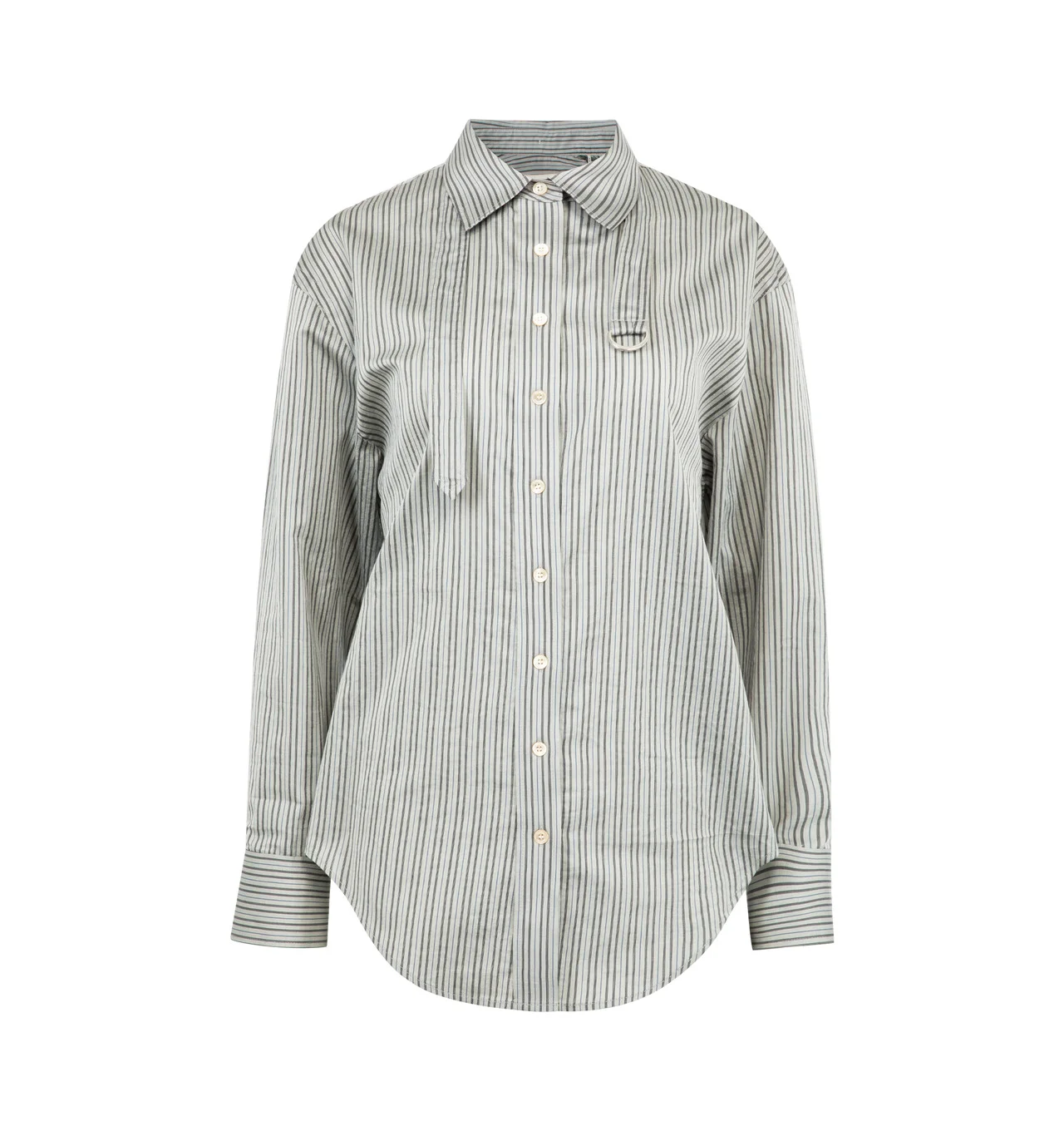 ISABEL MARANT Aurora Shirt featuring striped cotton poplin and silk shirt, shirt collar with tab and ring, long sleeves with straight buttoned cuffs, buttoned front, inverted rear pleat with adjustable string, rounded hem and oversized fit. 81% cotton, 19% silk. DESIGNER STYLE ID: CH0262FA-C4I01I COLOR: 02GY GREY