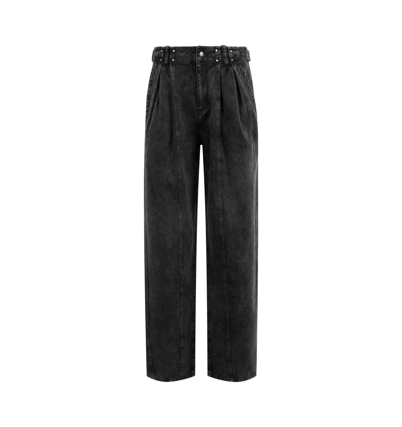 ISABEL MARANT Ireme Pant featuring cotton denim workwear pants, fitted waistband with belt loops, button tabs, and rivets, zippered and snap-buttoned, pockets on the sides and buttoned patch pockets in back and wide pleated legs. 100% cotton. DESIGNER STYLE ID: 26PPA0659FA-D1G02I COLOR: 02FK FADED BLACK