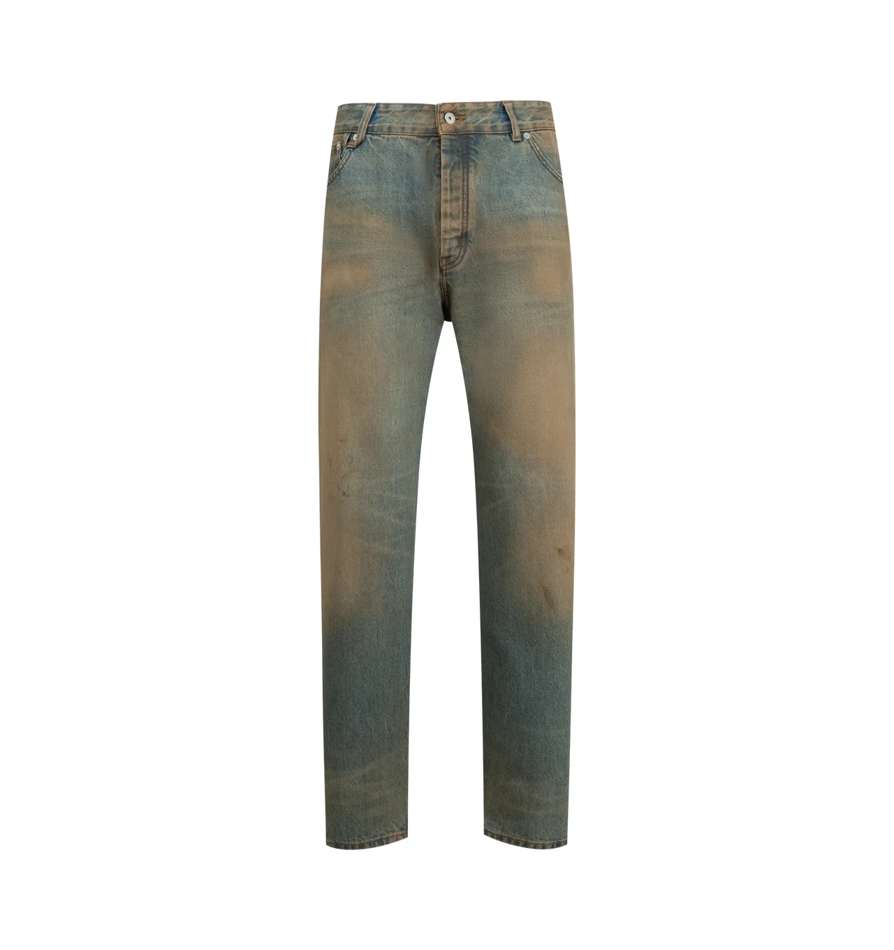 JACQUEMUS Le De-Nimes Berger Jean featuring distressed straight leg jeans, mid-rise, zip fly with engraved metal button, belt loop including one "J" loop, five pockets including a ticket pocket, metal rivets, embroidered patch on the back and contrasting topstitching. 100% cotton. Lining: 65% polyester, 35% cotton. Made in Italy. DESIGNER STYLE ID: 26EPAM00564AD00038 COLOR: 34B DISTRESSED BLUE/TABAC