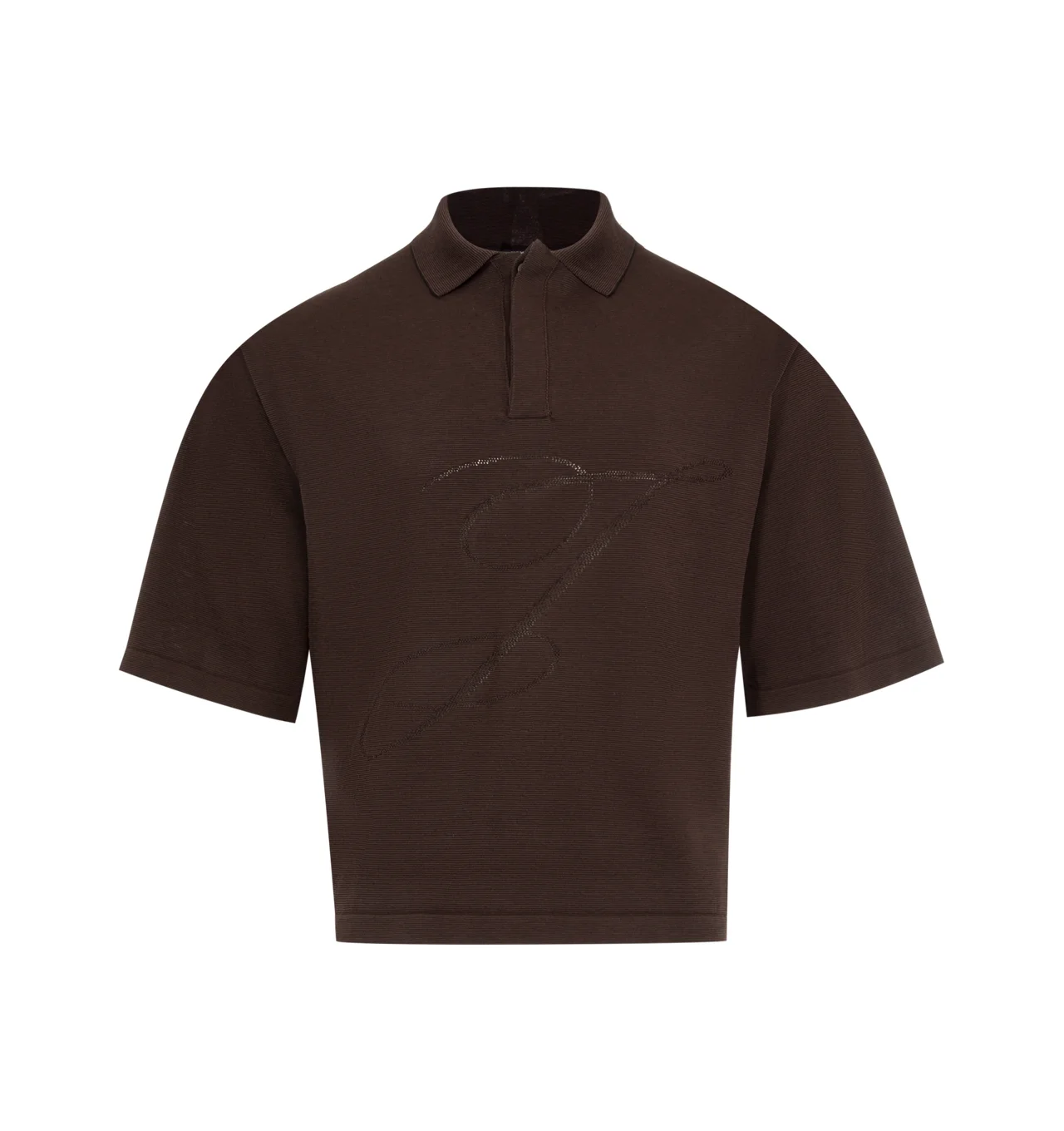 JACQUEMUS Le Polo Lino in Cotton-blend featuring ribbed polo collar, hidden front placket, elbow-length sleeves, ribbed cuffs and hem and jacquard “J” signature detail. 61% cotton, 35% linen, 4% silk. Made in France. DESIGNER STYLE ID: 25HP0M00602AK00263 COLOR: 880 DARK BROWN