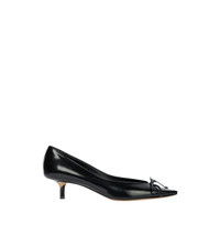 JACQUEMUS Tourni Heel featuring pump heels in smooth leather, pointed toe, small fixed bow, stitched edges, lambskin leather insole and lining, 4.5cm asymmetric twisted heels with lacquered finish and contrast outsole. 100% cow leather. Outsole: 100% cow leather. Made in Italy. DESIGNER STYLE ID: 25HF0W00179AC18A07 COLOR: 990 BLACK