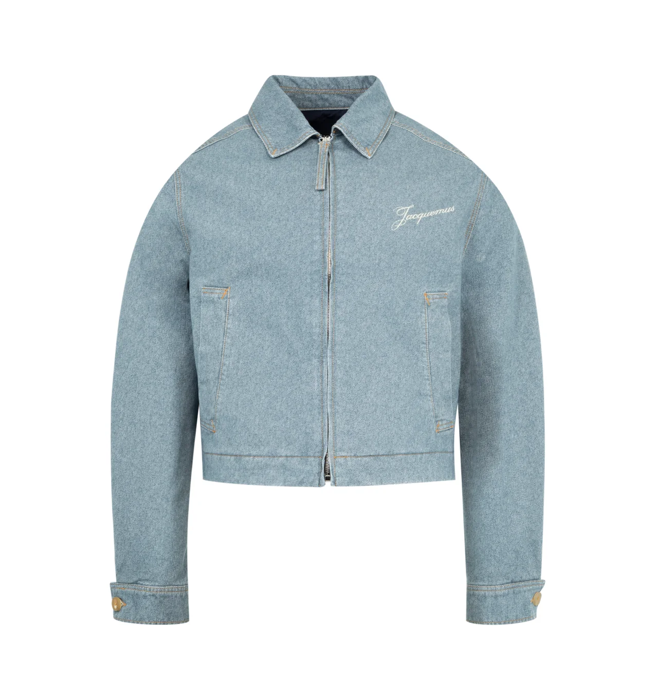 JACQUEMUS Zipped Denim Jacket featuring boxy fit, washed cotton denim, pointed collar, contrast bartacks, zipped closure with long puller, laser-printed logo on the chest, long sleeves, large welt pockets, contrast horn buttoned cuffs, embroidered patch on the back and back yoke. Cotton. Made in Italy. DESIGNER STYLE ID: 25H0UM00055AD00042 COLOR: 330 BLUE
