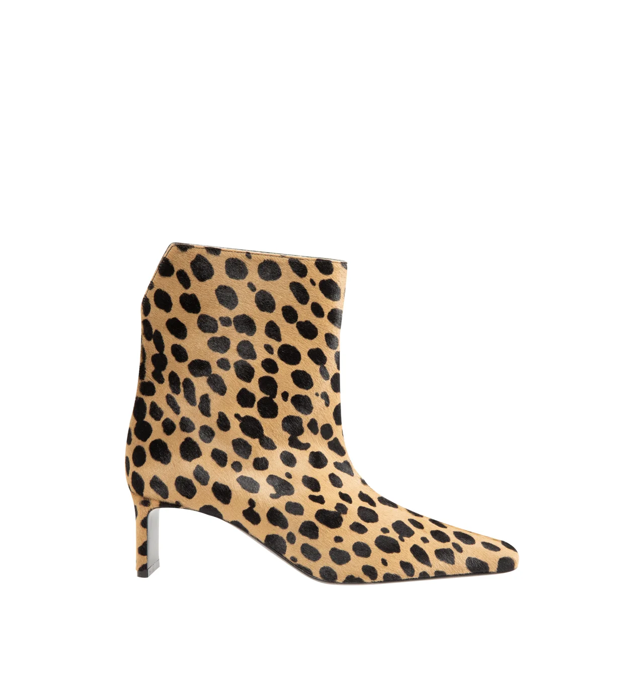 KHAITE Ona Ankle Boot featuring a distinctively notched back, square-toed, ankle boot, playfully printed haircalf, sleek blade heel and tonal outsole. Heel height: 2.2 in. 100% baby calf. Made in Italy. DESIGNER STYLE ID: F1100-969 COLOR: 836 CAMEL/BLACK