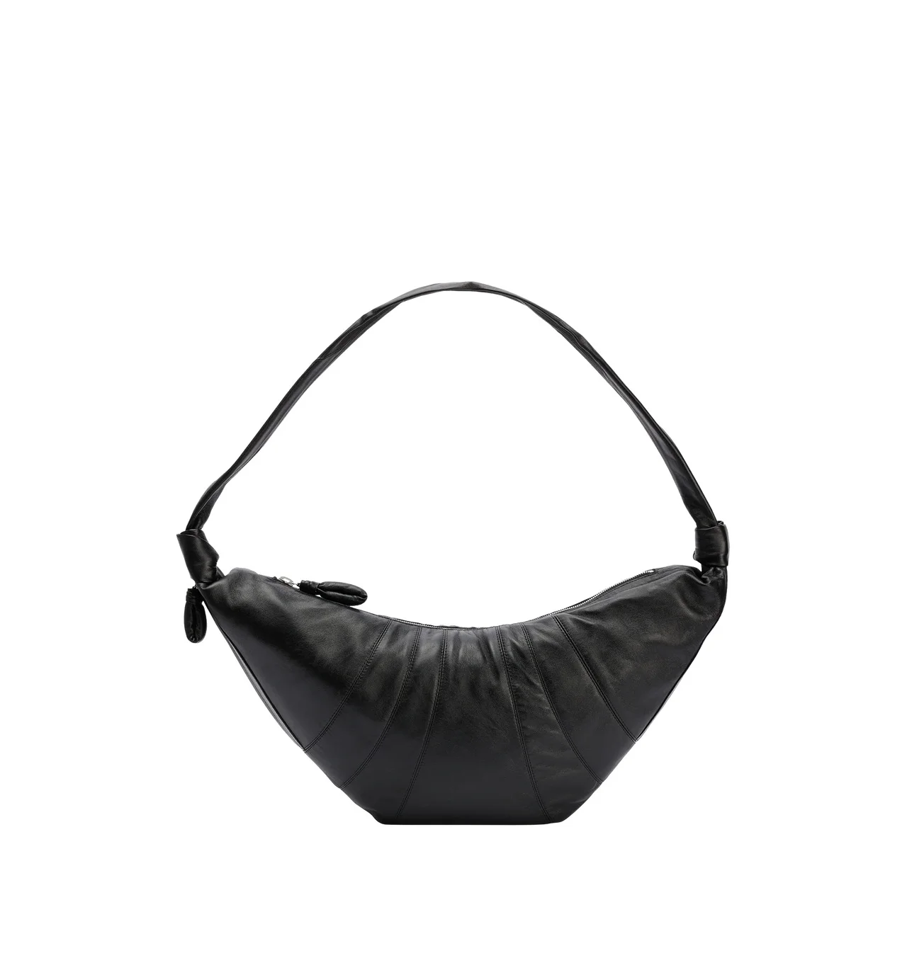 LEMAIRE Large Croissant Bag featuring quilted nappa lambskin shoulder bag, knotted detailing at crossbody strap, zip pocket at side, zip closure, detachable zip pouch at interior, patch pocket at interior, cotton canvas lining and silver-tone hardware. H11" x W23" x D2.5". Lambskin. Made in Spain. DESIGNER STYLE ID: BG0000-LL095 COLOR: BK999 BLACK