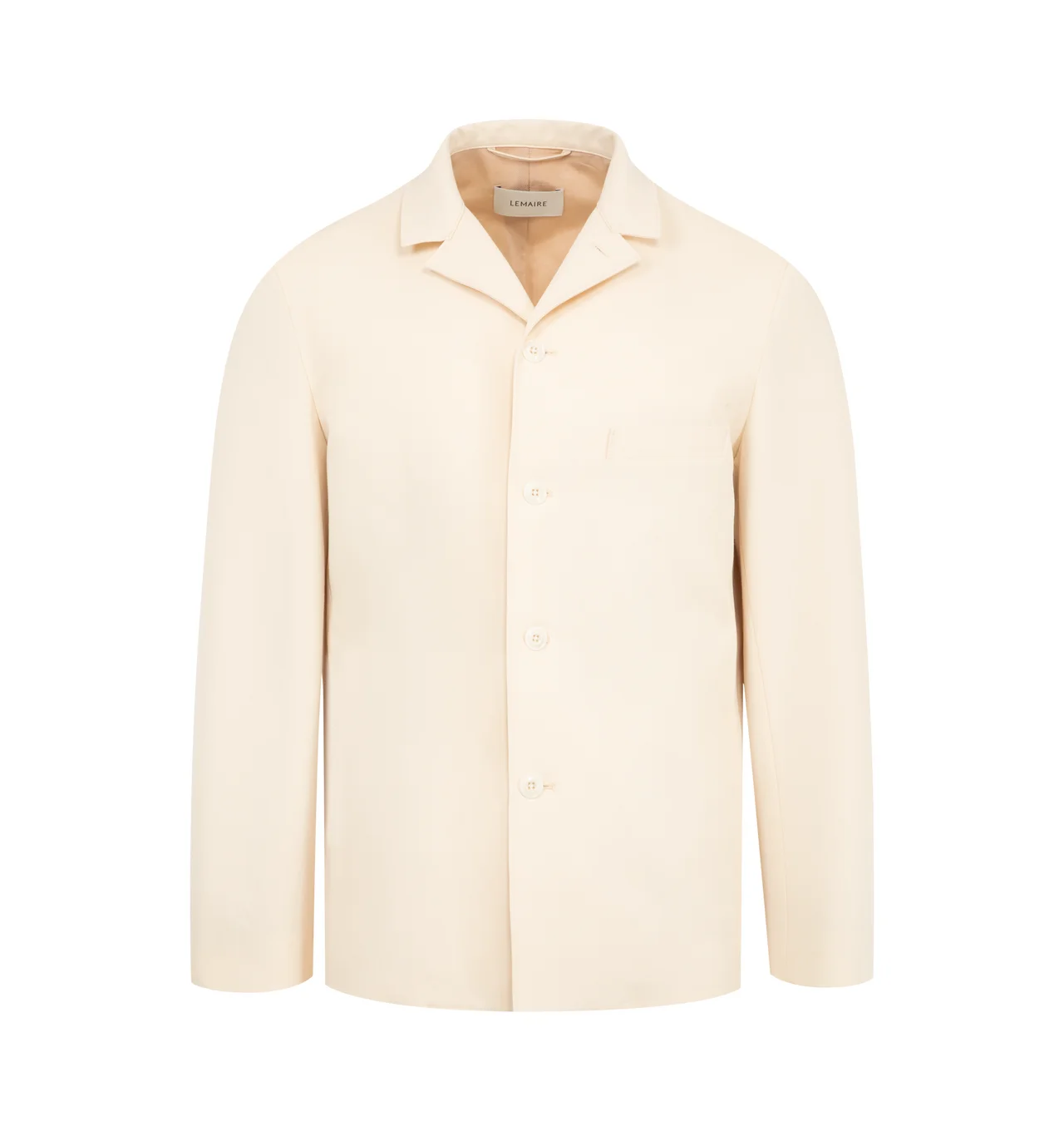 LEMAIRE Tailored Shirt Jacket featuring relaxed fit, buttoned fly, welt pocket, 2 internal pockets, buttoned cuffs and fully lined. 54% wool, 46% viscose. Made in Romania. DESIGNER STYLE ID: JA1064-LF1362 COLOR: BG198 LIGHT POWDER