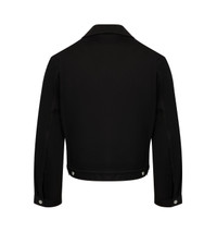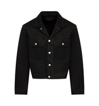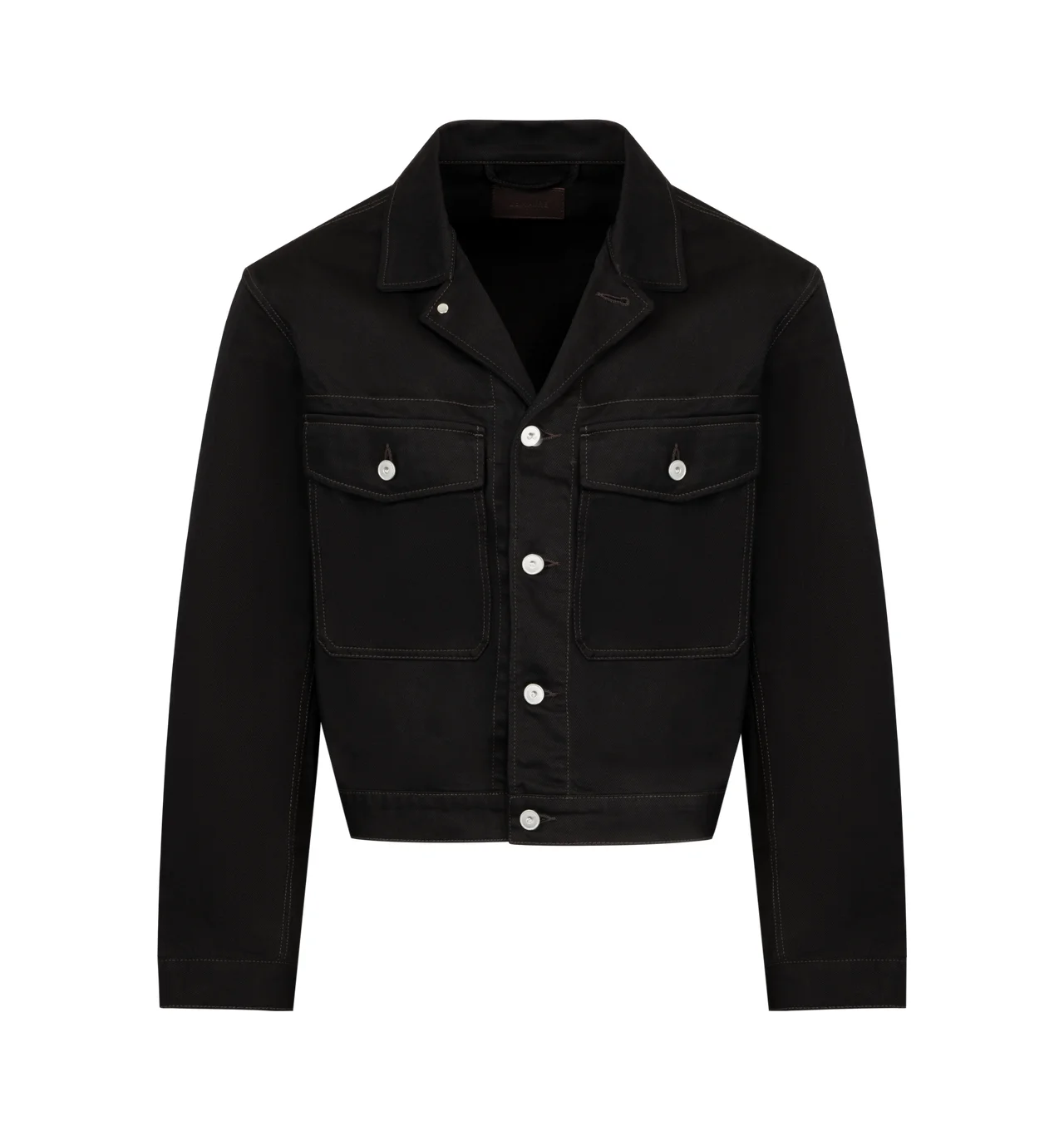 LEMAIRE Trucker Jacket featuring front button closure, buttoned cuffs, chest patch pockets with button flaps, adjustable tabs at waist, metal buttons and leather label. 100% cotton. DESIGNER STYLE ID: 0W1188-LD1055 COLOR: BK999 BLACK