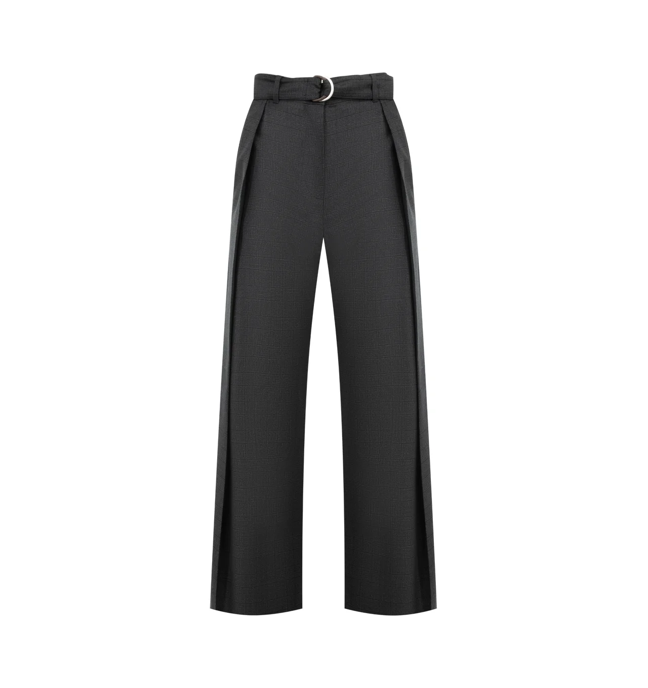 LOEWE Belted Trousers in lightweight checked fluid wool tailoring featuring an adjustable self belt, pleats at the front, regular fit, regular length, mid waist, straight leg, concealed zip fly, slash pockets and buttoned rear welt pocket, LOEWE engraved D-ring and LOEWE embossed leather patch placed at the back. Wool. Made in Italy. DESIGNER STYLE ID: S359Y04XHY COLOR: 1220 DARK GREY