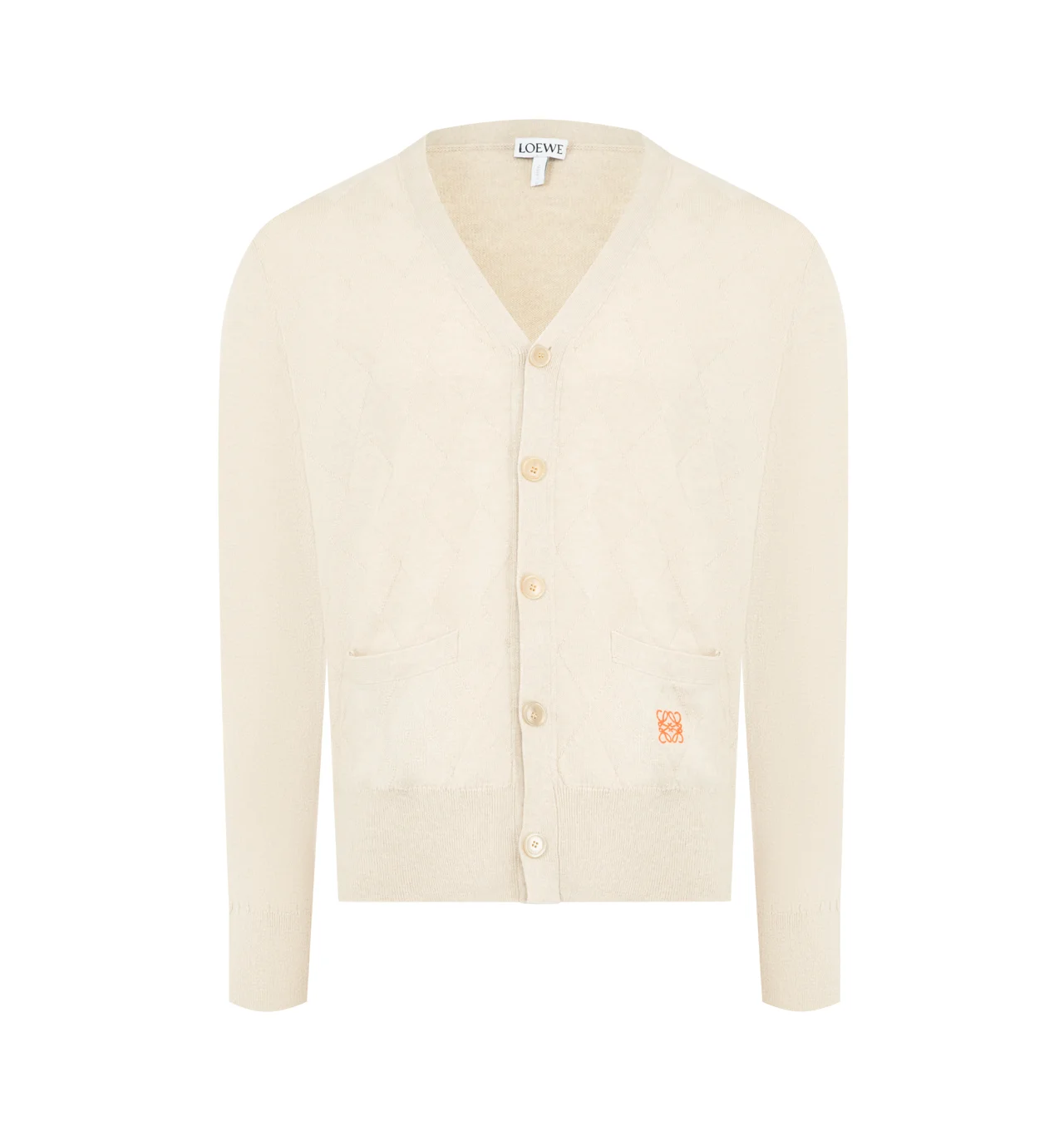 LOEWE Cardigan in lightweight wool and cashmere featuring an allover diamond pattern and contrast piping on the sides and inside sleeves, regular fit, regular length, jersey stitch, V-neck, button front fastening, ribbed cuffs and hem and contrast Anagram embroidery placed at the front. Wool/cashmere. Made in Italy. DESIGNER STYLE ID: H526Y16KAL COLOR: 2140 BEIGE