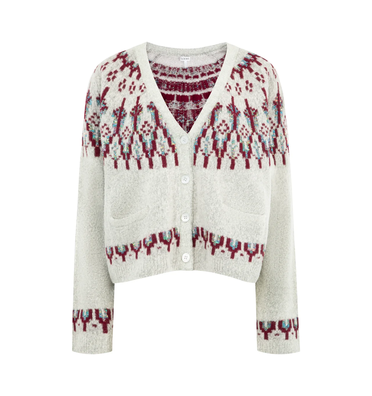LOEWE Cardigan in medium-weight wool blend featuring a boxy silhouette, a Fair Isle pattern with a sequinned yarn, relaxed fit, regular length, V-neck, button front fastening, welt pockets, ribbed cuffs and hem and LOEWE jacquard placed at the back. Wool/polyamide. Made in Italy. DESIGNER STYLE ID: S359Y16KAN COLOR: 1357 LIGHT GREY/MULTICOLOR