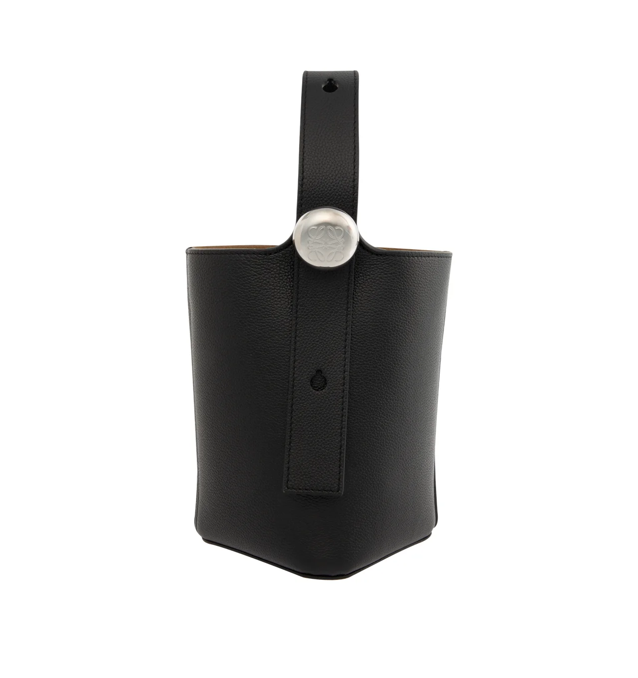 Loewe Pebble is a minimalistic bucket bag with a wide strap adjustable through an oversized Pebble closure. This mini version is crafted in soft grained calfskin.Crossbody, shoulder or hand carry with additional adjustable and removable strap. Features one internal pocket, suede lining, Anagram Pebble. Made in Spain. DESIGNER STYLE ID: AANBBBMX31 COLOR: 1100 BLACK