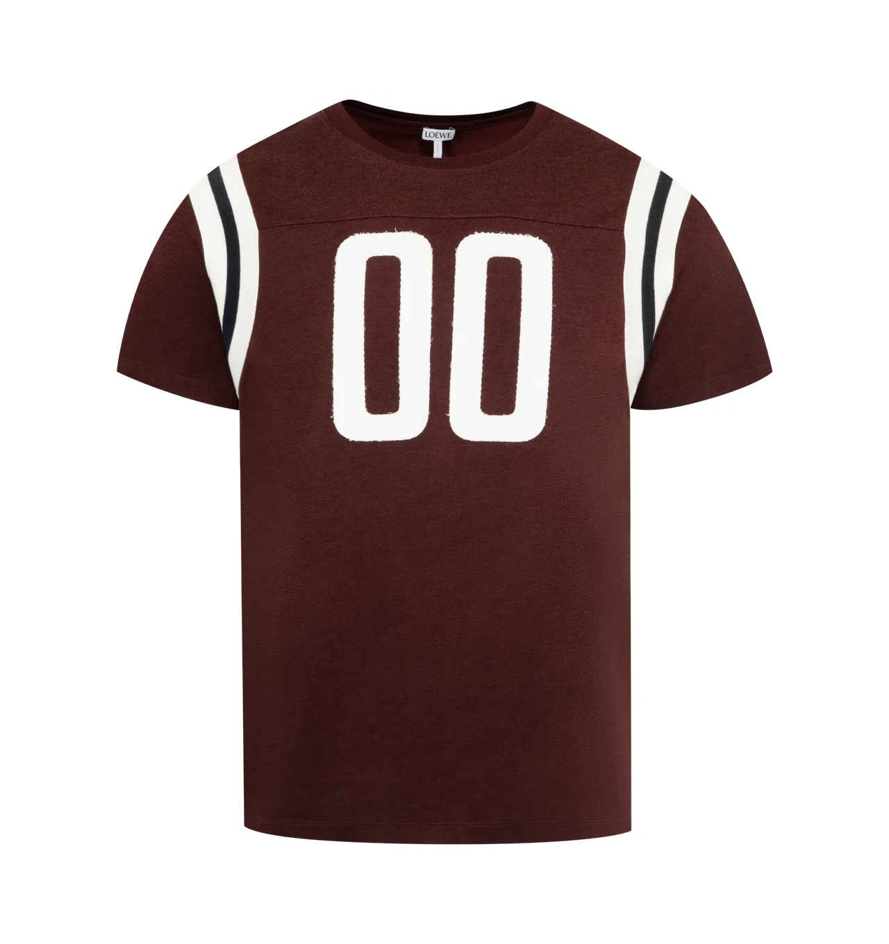 Loewe Men's T-shirt crafted in lightweight mercerized cotton jersey with a regular fit and length, crew neck, varsity striped knit armholes, stitched "00" numbers at front and Anagram embroidery placed at the back. Main material Cotton/Viscose. Made in Portugal. DESIGNER STYLE ID: H526Y22XBD COLOR: 7110 BURGUNDY