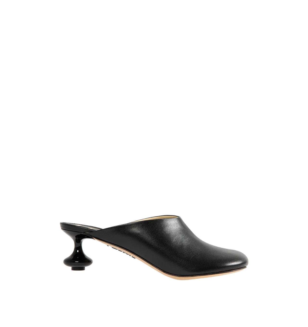 LOEWE Toy Mule crafted in goatskin with a petal shaped toe and lacquered signature toy heel. 45MM heel. Goatskin. Made in Italy. DESIGNER STYLE ID: L814379X28 COLOR: 1100 BLACK