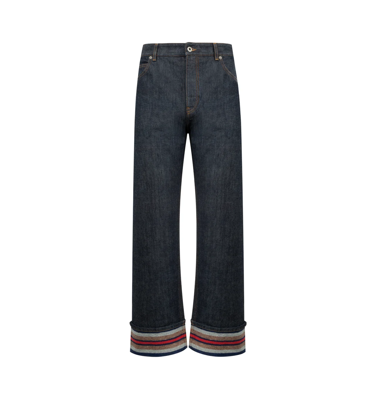 LOEWE Turn-up jeans in medium-weight double face cotton denim featuring a striped brushed cotton lining and turn-up cuffs, relaxed fit, regular length, mid waist, straight leg, concealed button fly, five pocket style and LOEWE embossed leather patch placed at the back. Cotton. Made in Italy. DESIGNER STYLE ID: H526Y11WAG COLOR: 6802 RAW DENIM/BLUE