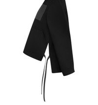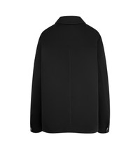 LOEWE Workwear Jacket in lightweight double face wool and cashmere featuring an asymmetric front to back hem with ties at the side, relaxed fit, regular length, classic collar, button front fastening, buttoned cuffs, patch pockets and LOEWE Anagram embossed leather pocket placed on the chest. 90% wool 10% cashmere. Made in Italy. DESIGNER STYLE ID: S359Y02XEZ COLOR: 1100 BLACK