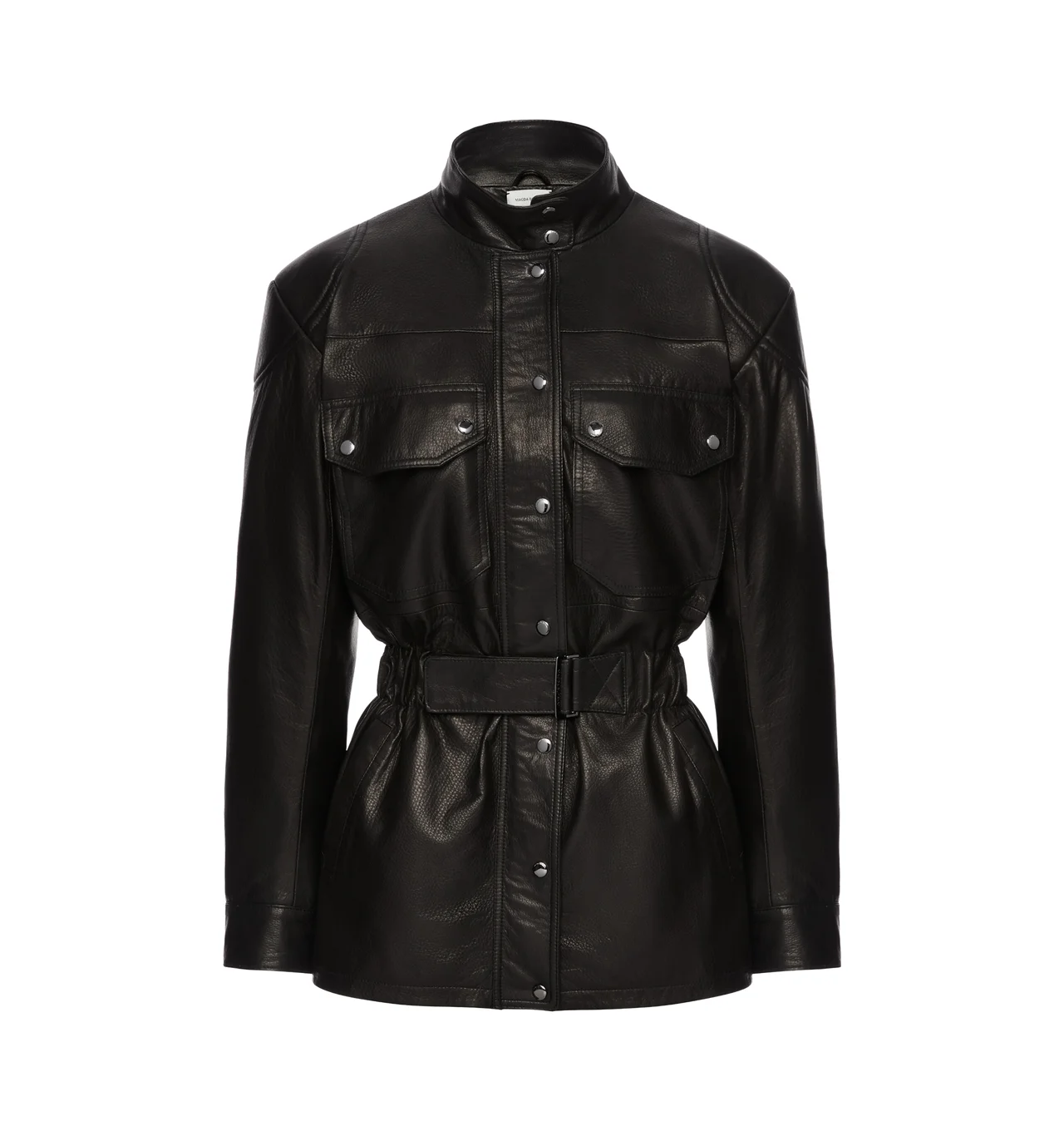 MAGDA BUTRYM Belted Utility Jacket featuring a structured utility-inspired silhouette with feminine definition, a high snap-button collar, concealed front zipper, contrast snap closures, gathered waist with an additional belt detail cinches the shape, flap pockets at the chest and vertical welt pockets at the hips. 100% sheep leather. DESIGNER STYLE ID: 160925 COLOR: BLACK