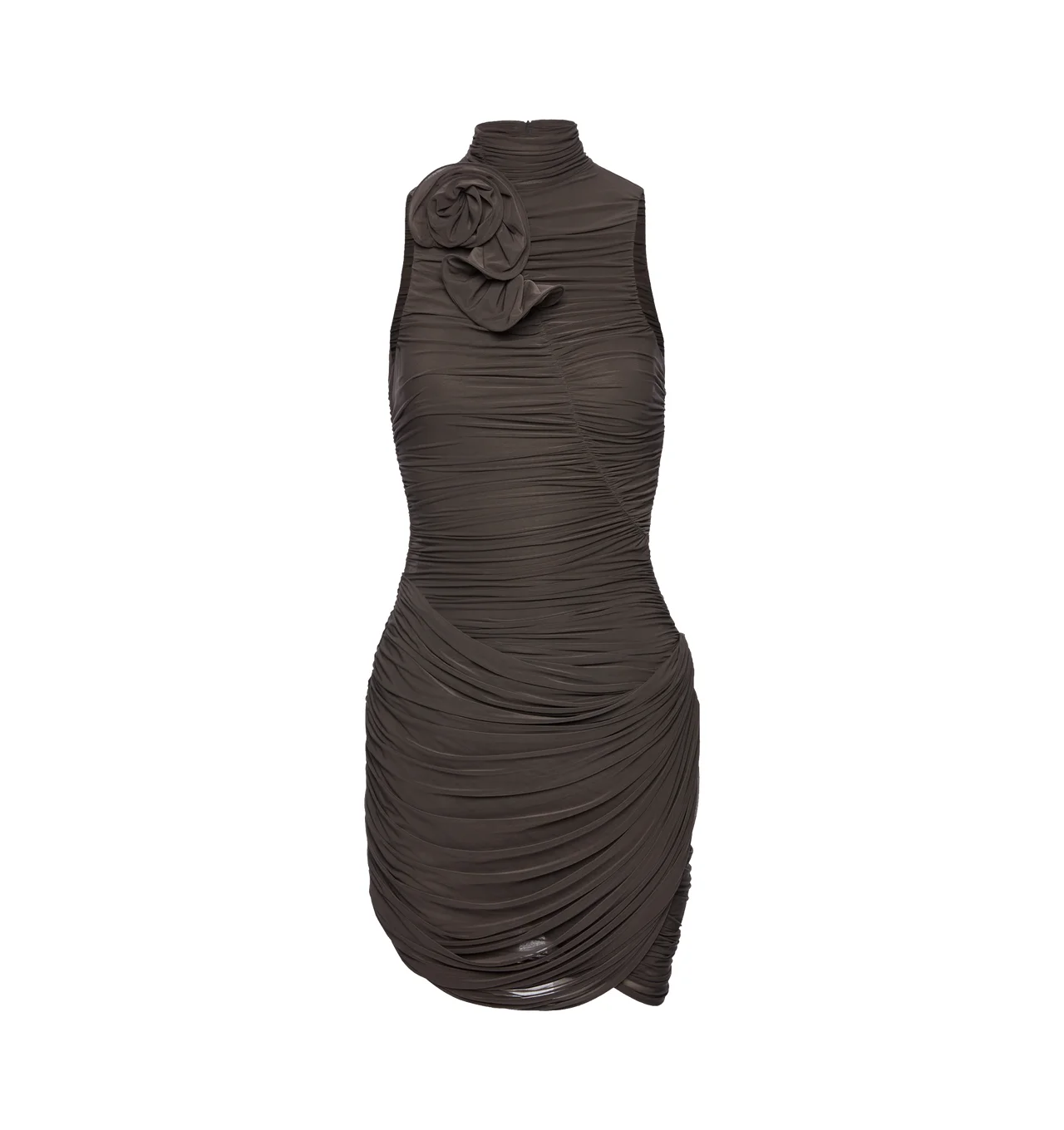 MAGDA BUTRYM High-Neck Draped Mini Dress featuring a figure-hugging mini dress with a ruched high neckline, sculptural detailing throughout, handcrafted floral applique adorns the neckline, additional drapes overlay at the hips to add volume, subtle padding accentuates the hips for a sculpted effect, a concealed back zip and an integrated bodysuit for a seamless fit. 92% cupro, 8% elastane. DESIGNER STYLE ID: 350426 COLOR: BROWN