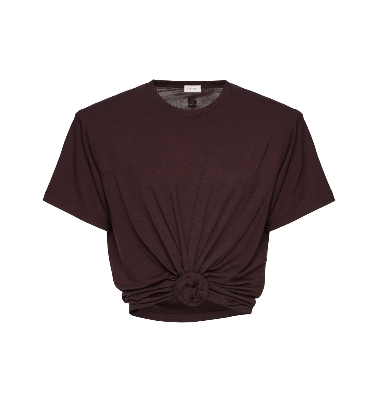 MAGDA BUTRYM Knotted Ribbed T-Shirt featuring classic ribbed t-shirt with a knotted detail at front, short sleeves, crew neck and detachable shoulder pads. 95% cotton, 5% elastane. DESIGNER STYLE ID: 102426 COLOR: BROWN