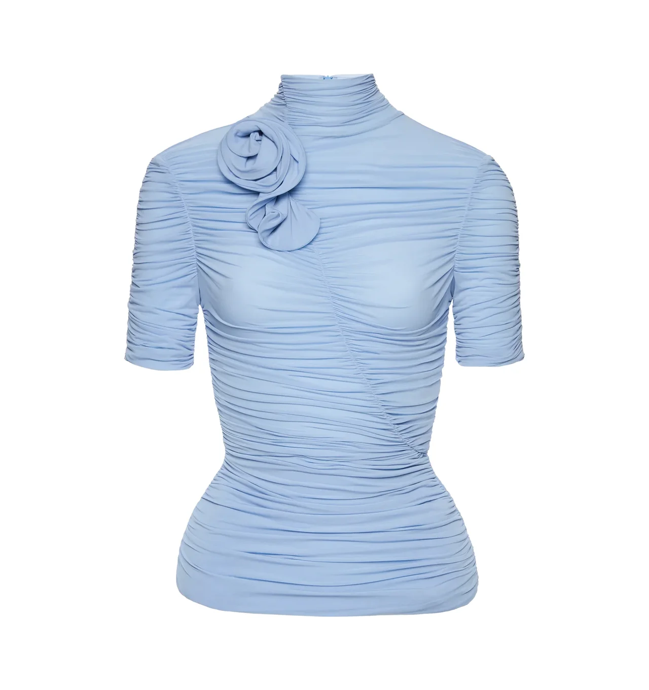MAGDA BUTRYM Ruched Cupro-Blend Top featuring fitted hip-length blouse crafted from a stretch cupro blend, a high ruched neckline, short gathered sleeves, diagonal front seams and softly draped ruching throughout the body, a sculptural flower detail is attached at the neck, subtle padding that enhances the hips and a concealed zip closure at the back. 92% cupro, 8% elastane. DESIGNER STYLE ID: 333426 COLOR: LIGHT BLUE