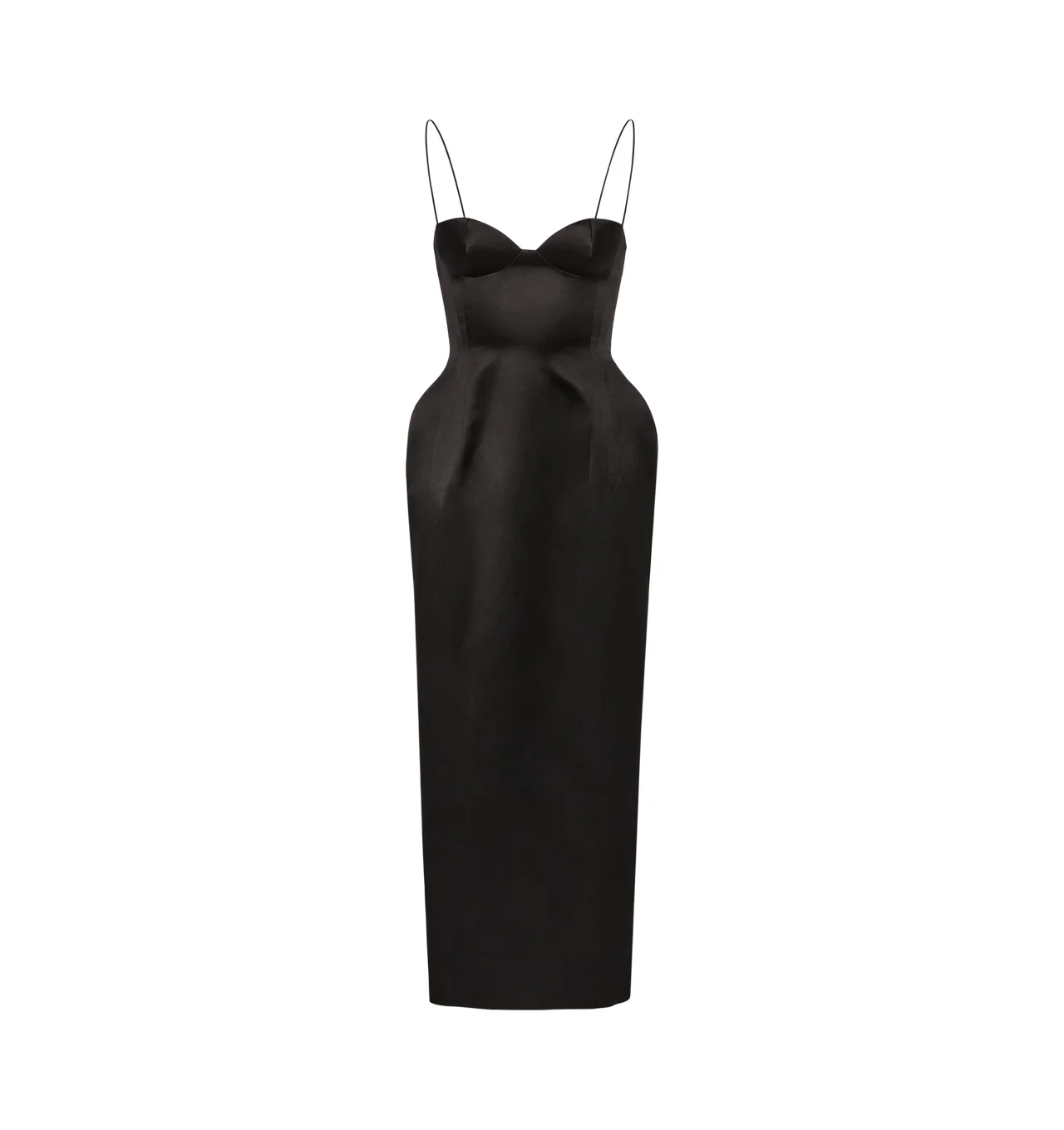 MAGDA BUTRYM Sweetheart Midi Dress featuring a feminine hourglass shape, created through a sweetheart bra with a fitted bodice and hip pads. 100% silk. DESIGNER STYLE ID: 245725 COLOR: BLACK