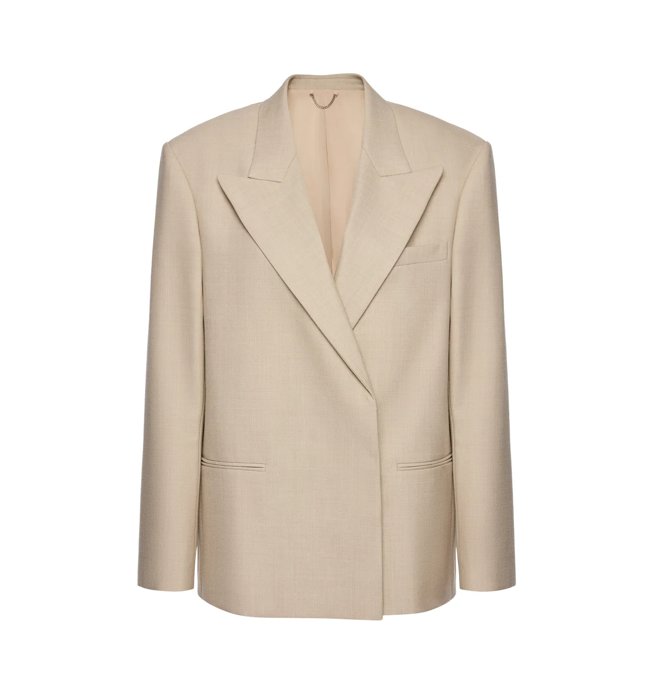 MAGDA BUTRYM Wool Crossover Blazer featuring oversized wool blazer with a modern crossover, buttonless fit and classic lapels. 100% wool. Lining: 100% silk. DESIGNER STYLE ID: 124725 COLOR: BEIGE