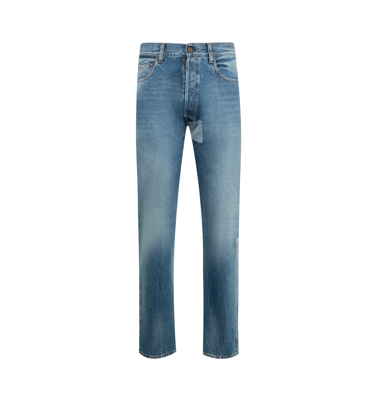 MAISON MARGIELA Tapered Leg Jeans featuring a faded wash, rectangular patch and stitch detail at the upper thigh, straight leg and four stitches at the back. 100% cotton. Made in Italy. DESIGNER STYLE ID: S50LA0241-S30561 COLOR: 986 BLUE