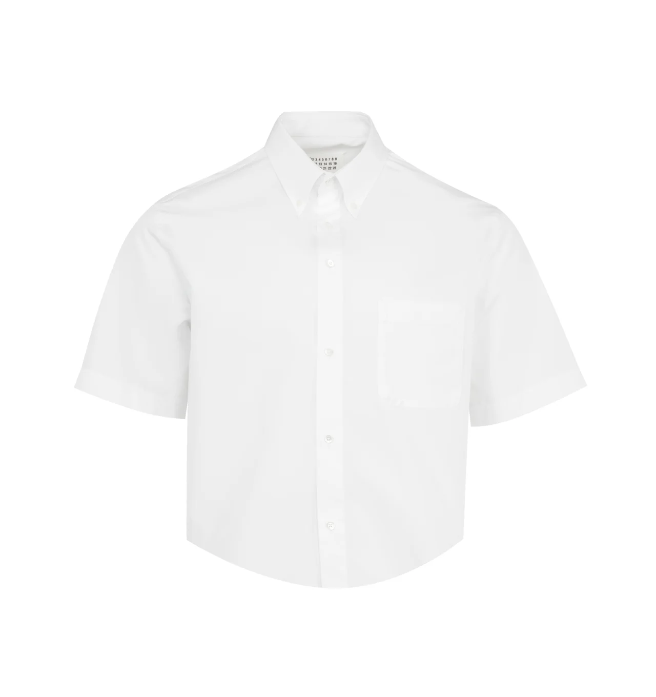 MAISON MARGIELA Cropped Short Sleeve Shirt featuring short-sleeves, button-down collar, chest patch pocket and button front closure. 100% cotton. Made in Italy. DESIGNER STYLE ID: S50DR0012-S43001 COLOR: 100 WHITE