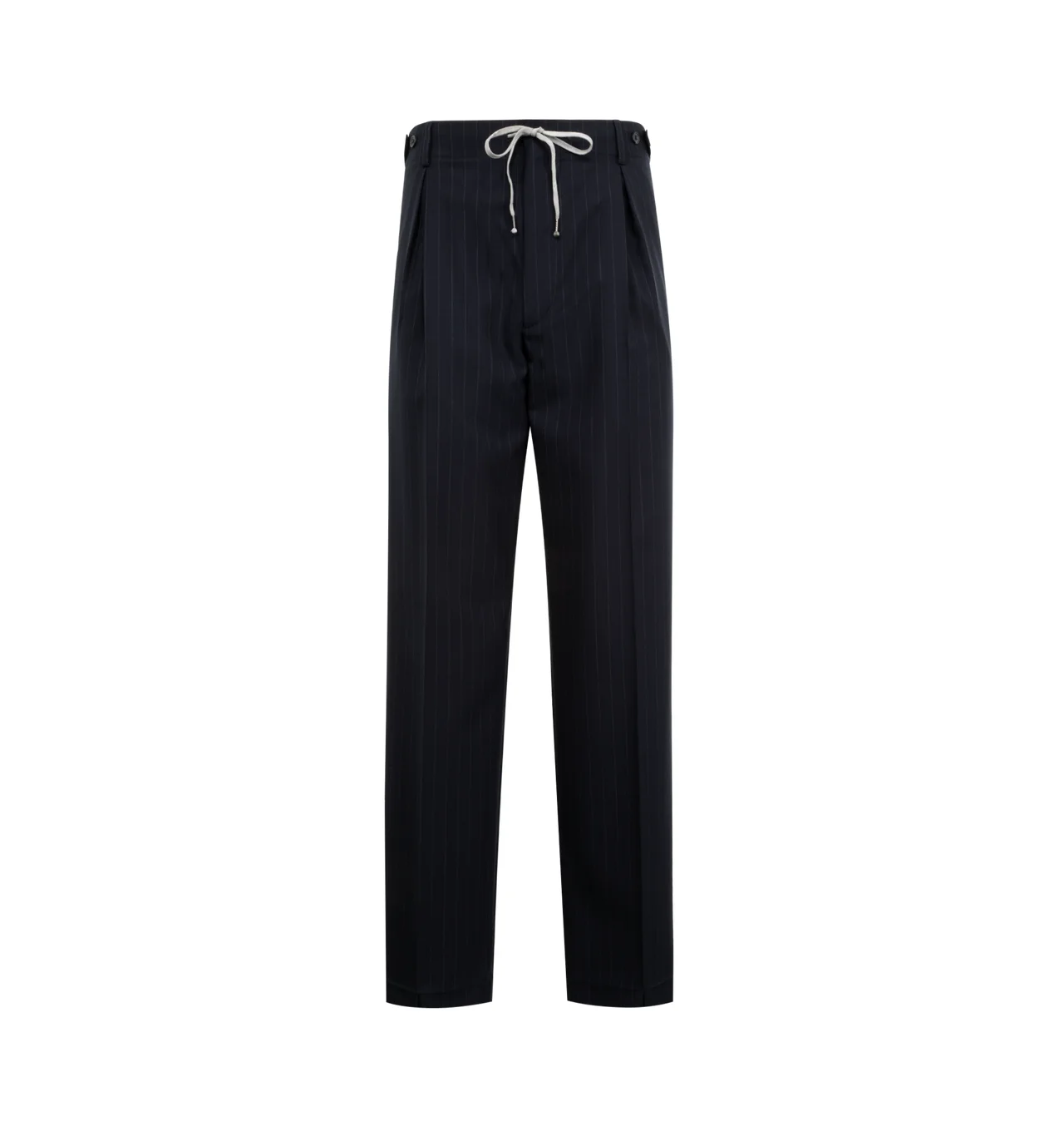 MAISON MARGIELA Pinstripe Wide Trousers featuring a drawstring waist with loops and buttons, two side welt pockets, one back welt pocket with button, front pleats, and Four Stitches logo on the back. 100% wool. Lining: 100% viscose. Made in Italy. DESIGNER STYLE ID: S67KA0080-M35581 COLOR: 524F