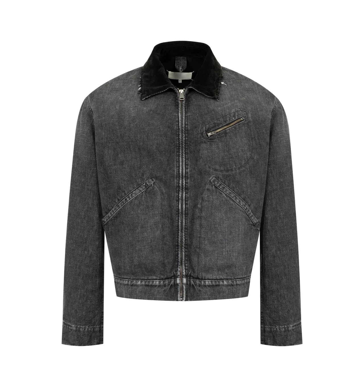 MAISON MARGIELA Cotton Denim Workwear Zip Jacket featuring hidden front zip closure, 3-pocket design, buttoned cuffs, corduroy collar with fringe trim and midweight denim. 100% cotton. Made in Italy. DESIGNER STYLE ID: S67AM0107-M30036 COLOR: 962