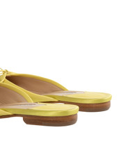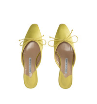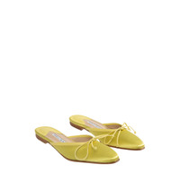 Manolo Blahnik Satin Bow Ballerina Flats in a slide-on style featuring grosgrain trim and bow accent, 10 mm flat heel, almond toe, leather outsole and leather lining. Made in Italy. DESIGNER STYLE ID: 125-2935 COLOR: 3296 BRIGHT GREEN