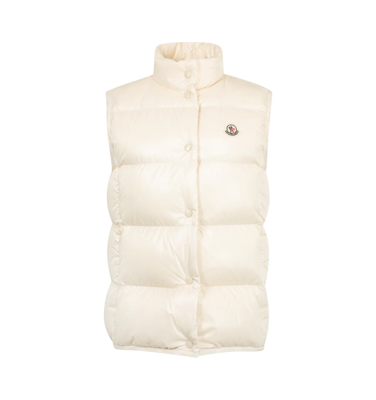 MONCLER Badia Down Vest featuring nylon laque lining, down-filled, snap button closure, zipped pockets and logo trim. 100% polyamide/nylon. Padding: 90% down, 10% feather. DESIGNER STYLE ID: 1A001-69-5963V COLOR: 070 WHITE