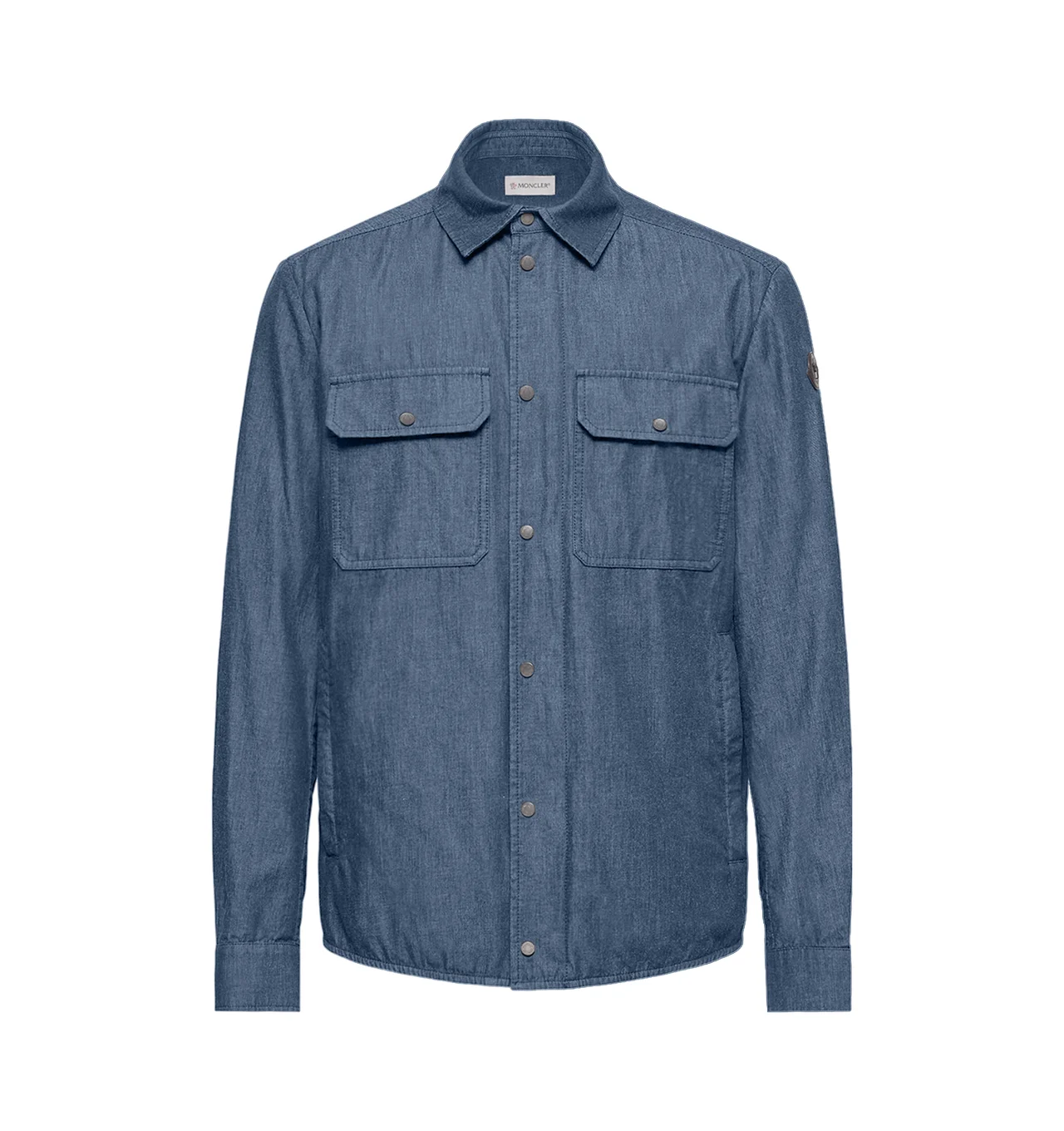 MONCLER Denim Shirt Jacket featuring zipper and snap button closure, pockets with snap button closure, adjustable cuffs and leather logo patch. 100% cotton. DESIGNER STYLE ID: 2F000-58-599J3 COLOR: 786 BLUE