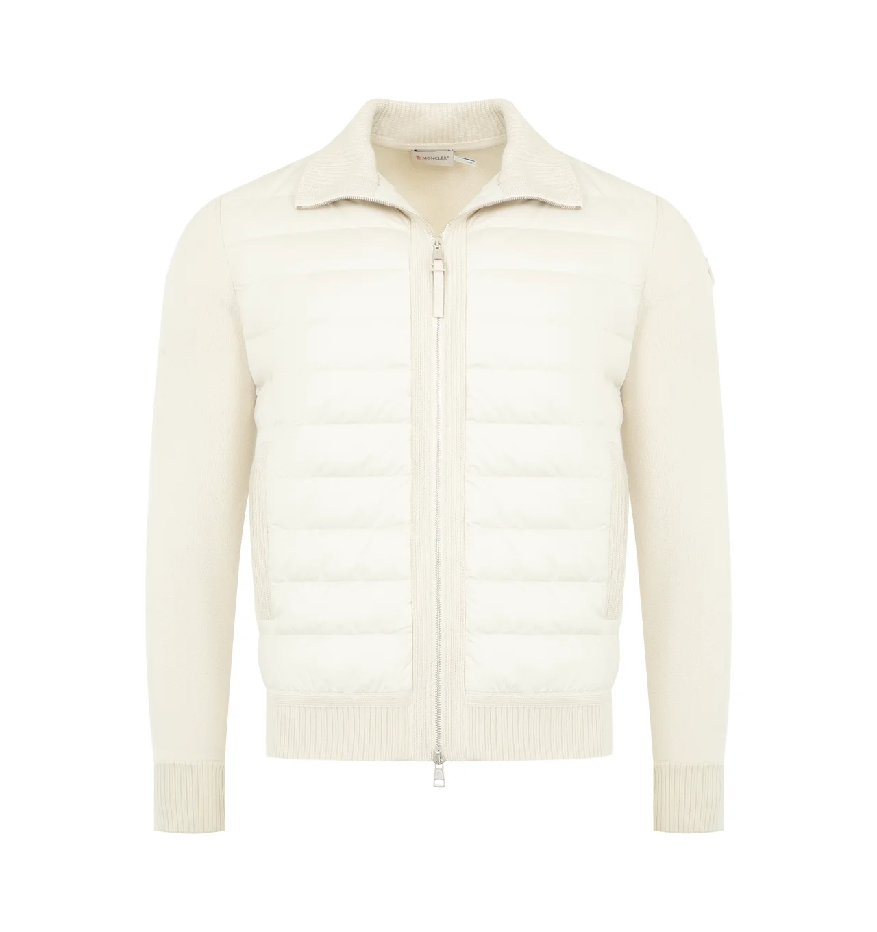 MONCLER Padded Wool Cardigan featuring recycled rainwear lining, down-filled and padded, tricolour hood, waffle stitch, gauge 12, zip closure, welt pockets and logo. 100% polyester. Padding: 90% down, 10% feather. Base fabric: 100% virgin wool. DESIGNER STYLE ID: 9B000-11-M1131 COLOR: 20F LIGHT BEIGE