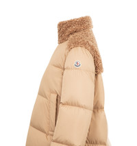 MONCLER Esnaie Teddy-Trimmed Short Down Jacket featuring polyester lining, collar and back yoke in teddy fleece, down-filled, zipper closure and zipped pockets. 100% polyester. Padding: 90% down, 10% feather. Made in Moldova. DESIGNER STYLE ID: 1A001-47-54AQE COLOR: 513 TAN