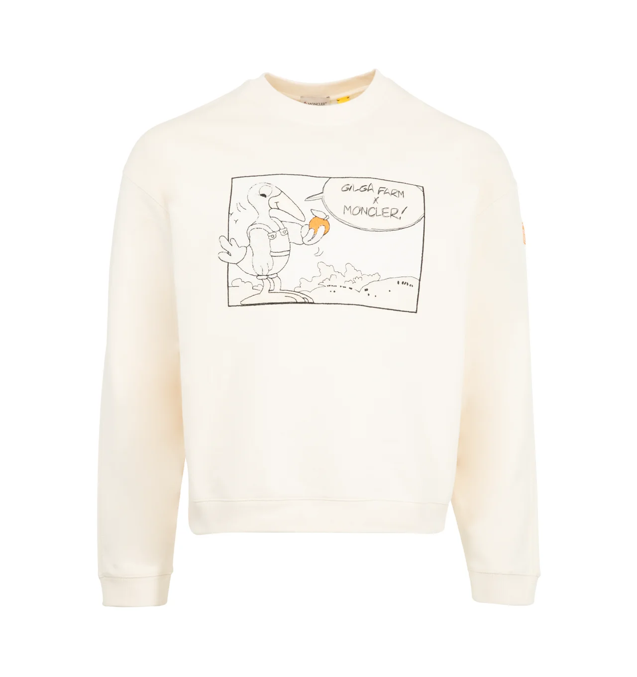 Moncler x Gilga Farm Designed by Donald Glover Cotton Sweatshirt shows the brand's mascot visiting Donald Glover's Gilga farm. The playful Moncler x Gilga Farm designed by Donald Glover crew neck is crafted from soft cotton fleece.Crafted from 100% Cotton fleece featuring 95% Cotton, 5% Elastane / Spandex rib trim, 100% Polyester emboidered logo motif, crew neck, and logo patch. Made in Turkey. DESIGNER STYLE ID: 8G000-02-89AUJ COLOR: 02B CREAM