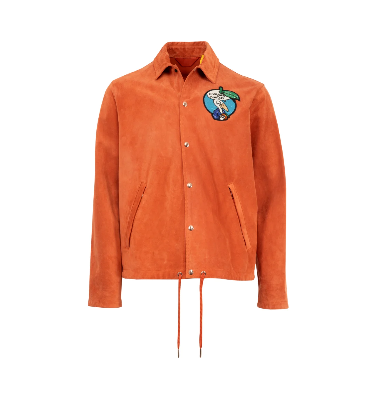 Moncler x Gilga Farm Designed by Donald Glover Navel Suede Shirt Jacket is inspired by creative life on Donald Glover's Gilga Farm. The Moncler Genius suede overshirt is embellished with beaded motifs depicting the Mon Duck character at the farm. The shacket's color palette references sunsets seen over the Californian farm. Crafted from cow leather suede featuring snap button closure, zipped pockets, hem with drawstring fastening and beaded logo motifs at the side and back. Made in Italy. For personal consultation and detailed information about jewelry, please contact our dedicated stylist team at personalshopping@hirshleifers.com. This item may be restricted for online purchase to international clients. For assistance purchasing this item please contact our dedicated stylist team at personalshopping@hirshleifers.com. DESIGNER STYLE ID: 1A000-08-M6348 COLOR: 335 ORANGE