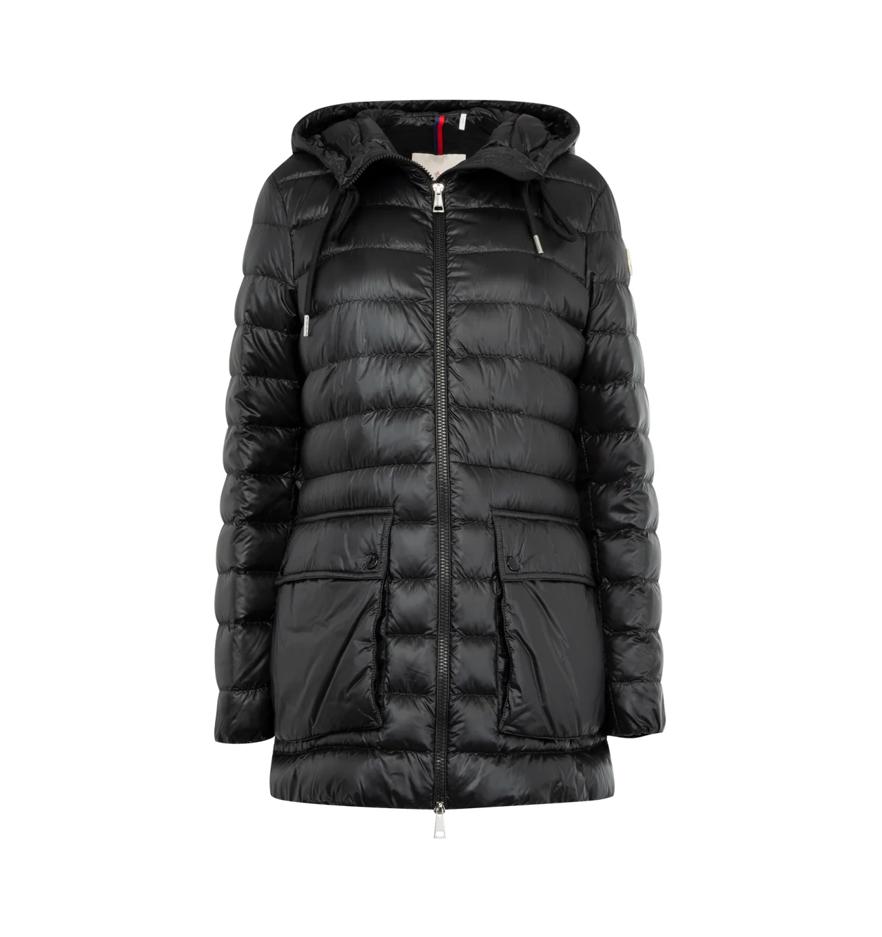 MONCLER Jasmin Hooded Short Down Parka featuring signature embroidered logo patch on the left sleeve, adjustable drawstring hood, long sleeves with elastic cuffs, flap pockets with snap closures, classic fit and two-way zip-front. Nylon/polyamide. Fill: Down/feather. Lining: Polyester. DESIGNER STYLE ID: 1A000-29-597YG COLOR: 999 BLACK