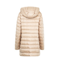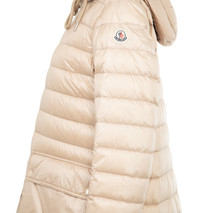 MONCLER Jasmin Hooded Short Down Parka featuring signature embroidered logo patch on the left sleeve, adjustable drawstring hood, long sleeves with elastic cuffs, flap pockets with snap closures, classic fit and two-way zip-front. Nylon/polyamide. Fill: Down/feather. Lining: Polyester. DESIGNER STYLE ID: 1A000-29-597YG COLOR: 212 BEIGE