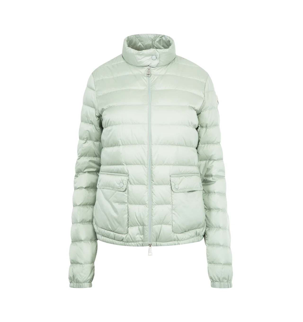 MONCLER Lans Short Down Jacket featuring tech fabric with down fill, standup collar featuring snap buttons, zip-up closure, flap pockets and logo patch at sleeve. 100% polyamide/nylon. Padding: 90% down, 10% feather. Made in Armenia. DESIGNER STYLE ID: 1A101-00-53048 COLOR: 91Z SAGE