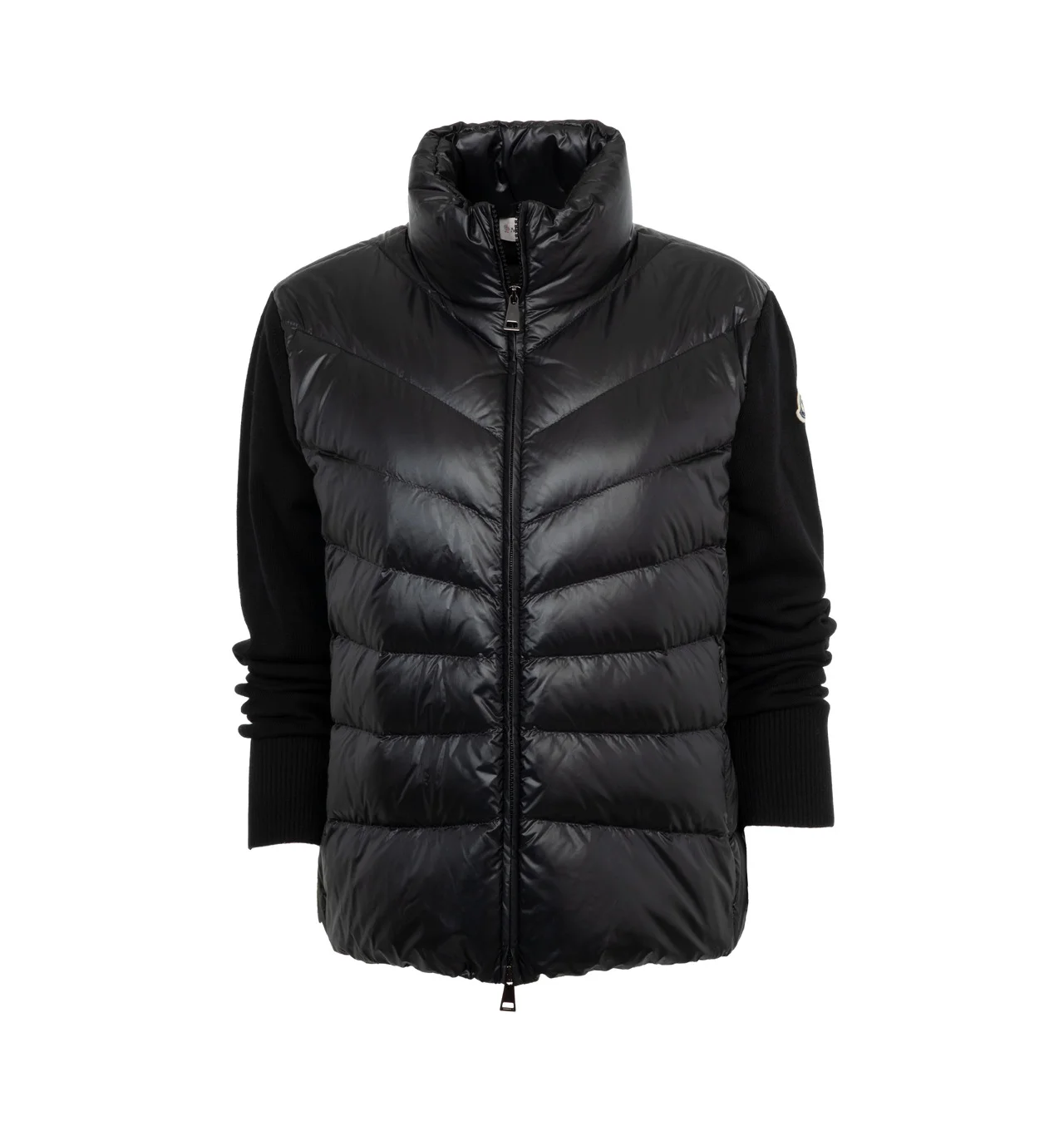 MONCLER Padded Cardigan featuring ultra-fine Merino wool, longue saison lining, down-filled longue saison front, rib knit sleeves, gauge 14, zipper closure, zipped pockets and logo patch. 100% polyamide/nylon. 100% virgin wool. Padding: 90% down, 10% feather. DESIGNER STYLE ID: 9B000-24-M1131 COLOR: 999 BLACK