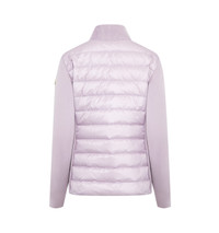 MONCLER Padded Wool Cardigan featuring padded bodice finished with knit collar and sleeves, stand collar, long sleeves, embroidered logo patch at left sleeve, classic fit , hem sits at the hip and two-way zip-front. Nylon/polyamide/virgin wool. Fill: Down/feather. DESIGNER STYLE ID: 9B000-31-M1131 COLOR: 61B PURPLE