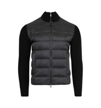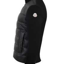 MONCLER Padded Wool & Cashmere Zip-Up Cardigan featuring a wool and cashmere blend, micro chic nylon lining, down-filled front, interlock knit, gauge 12, zipper closure, zipped pockets with an embossed leather trim and leather logo patch. 100% polyester. 90% virgin wool, 10% cashmere. Padding: 90% down, 10% feather. Made in Moldova. DESIGNER STYLE ID: 9B000-51-M4281 COLOR: 999 BLACK