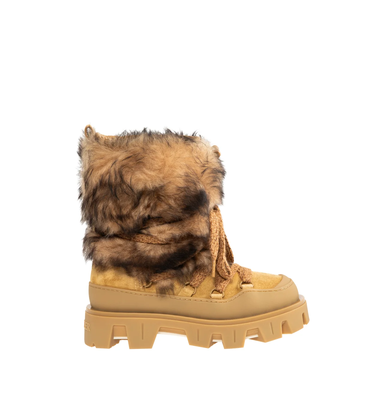 MONCLER Peak Apres Suede & Shearling Boots featuring long-haired lambskin and suede upper, mesh and neoprene insole, rubberized TPU sole with EVA filler and elastic drawstring and lace-up closure. Calf length 18 cm. Sole height 4.5 cm. DESIGNER STYLE ID: 4G000-60-M7598 COLOR: 23N BROWN